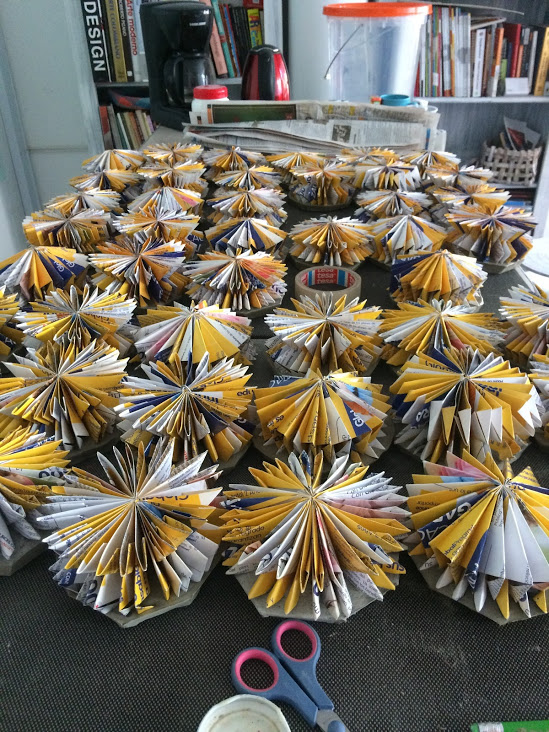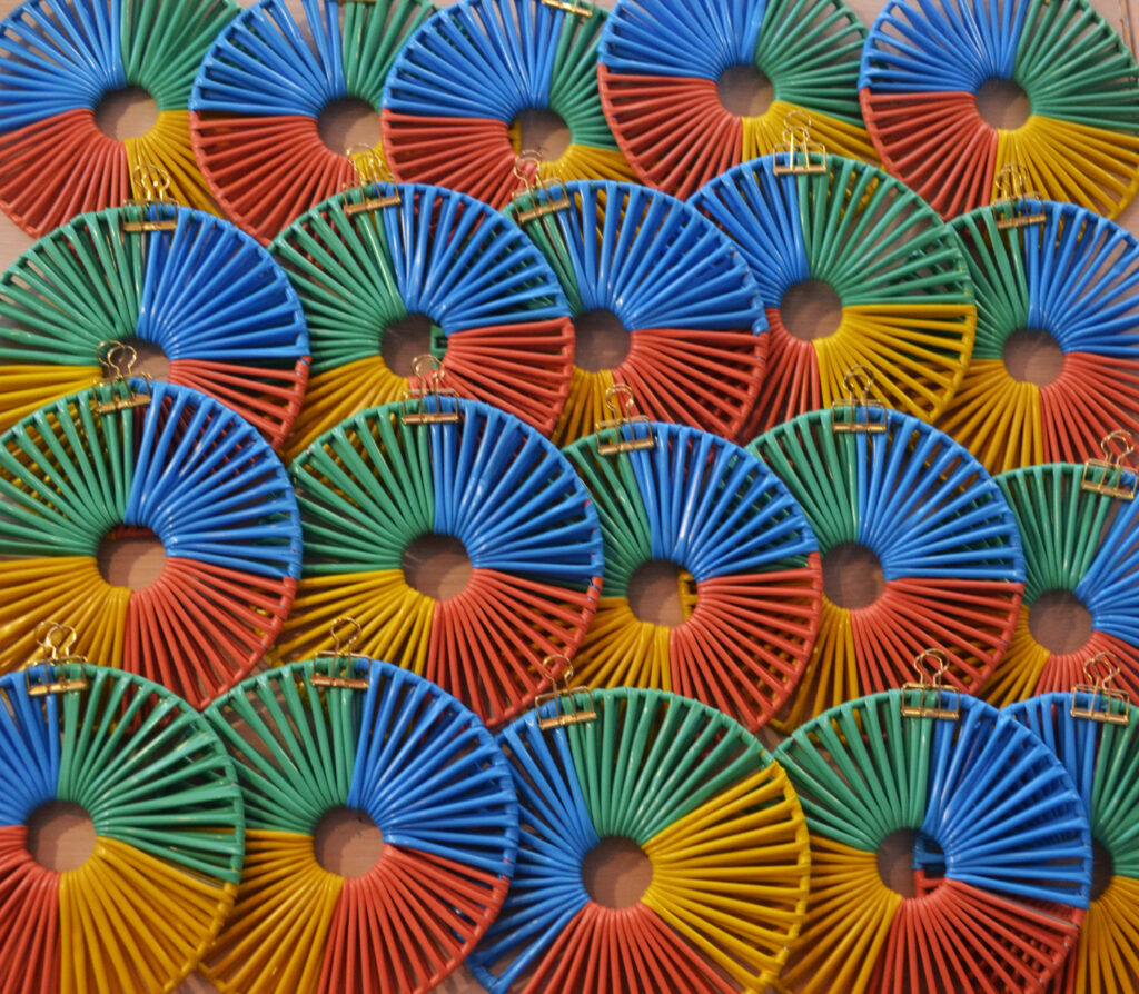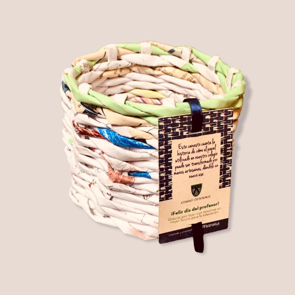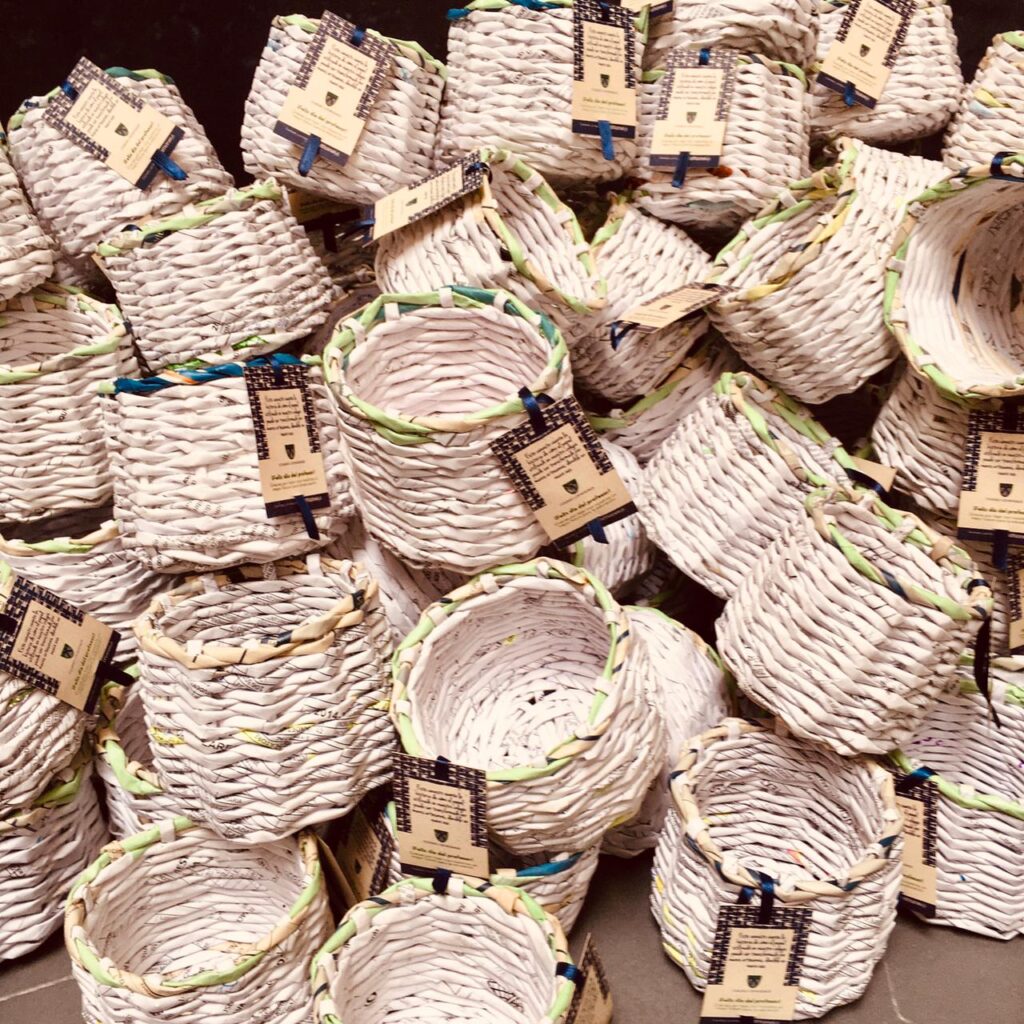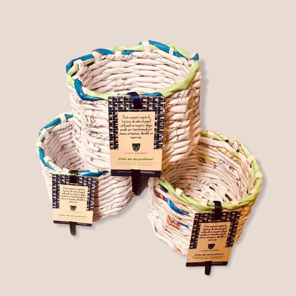 Canastos tejidos a mano con papel reciclado recolectado en las instalaciones del colegio como proyecto para regalo del día del profesor.