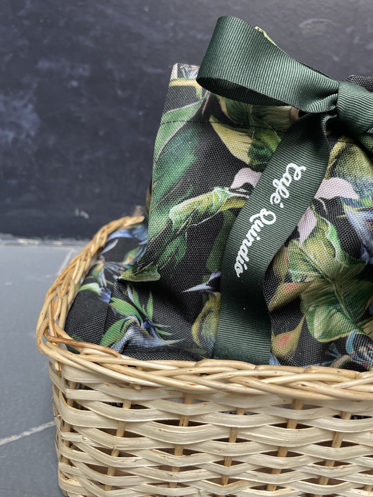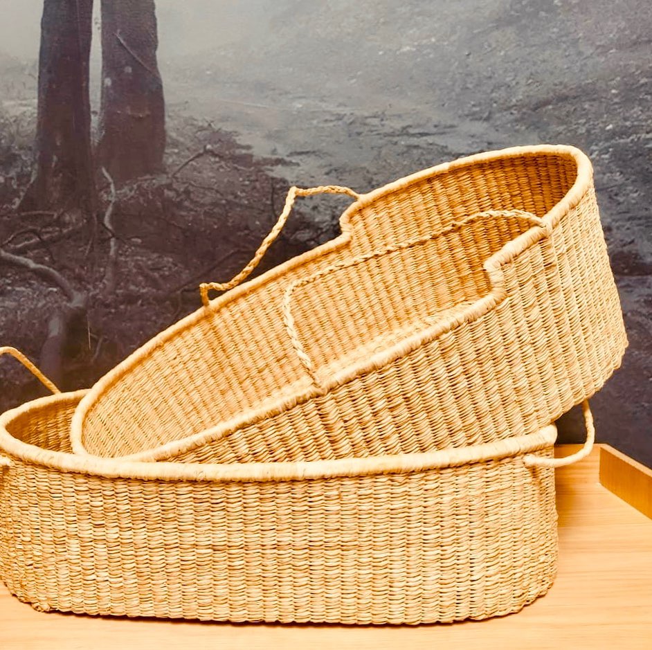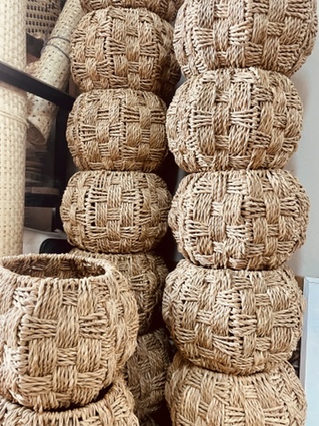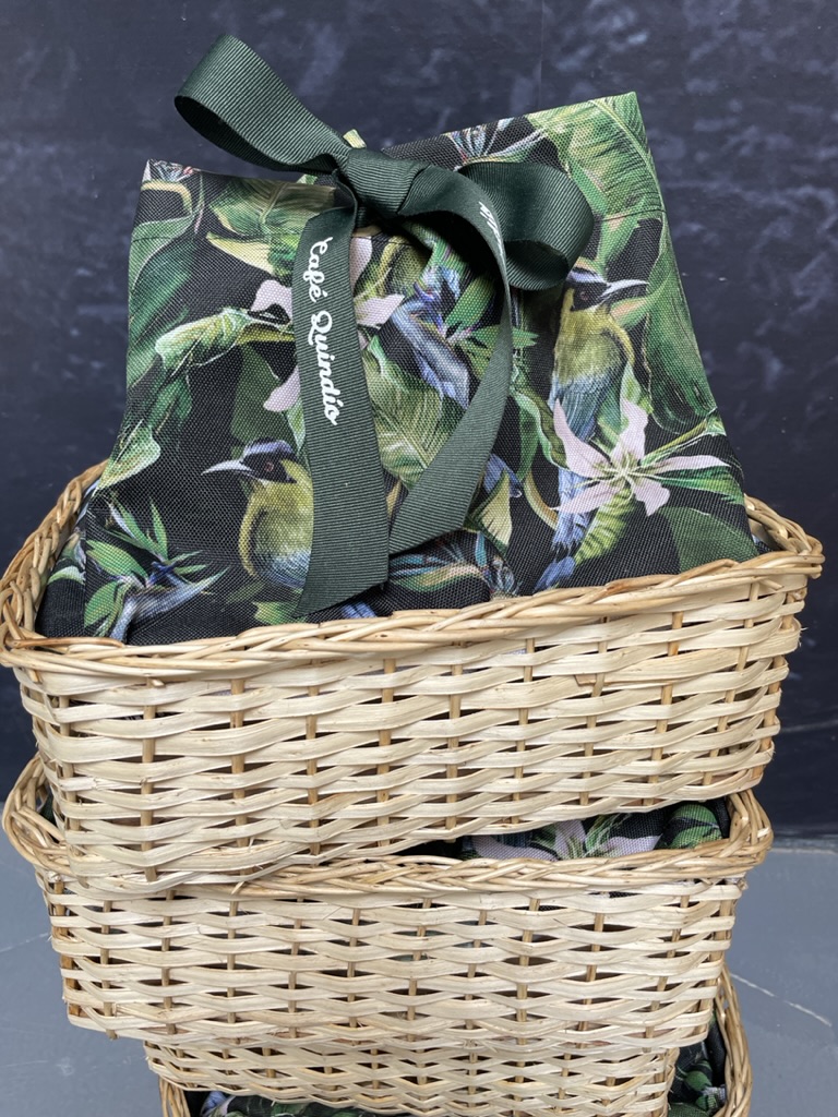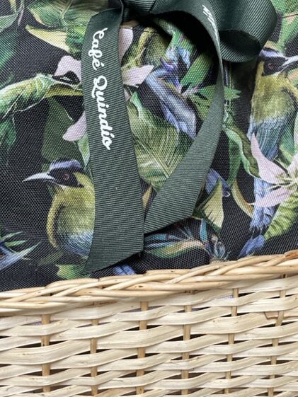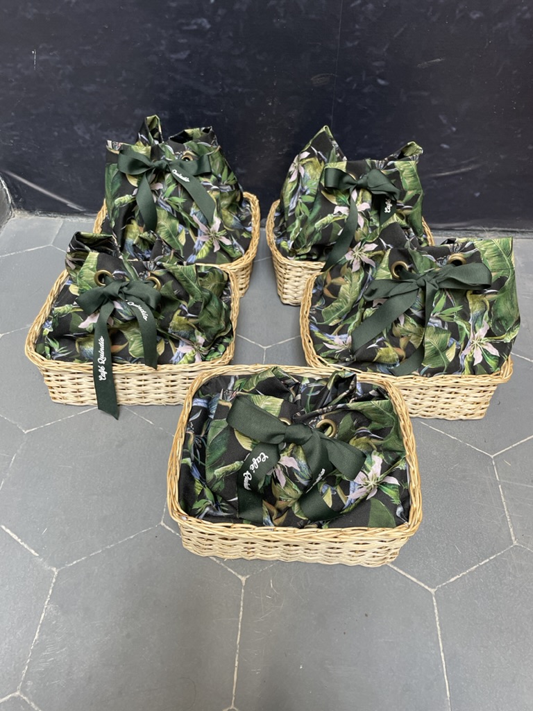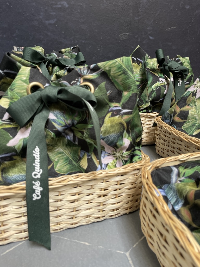 Diseño y producción de anchetas tejidas en mimbre natural ensambladas con tela estampada a la medida del cliente.