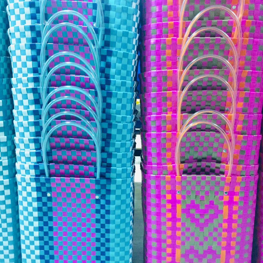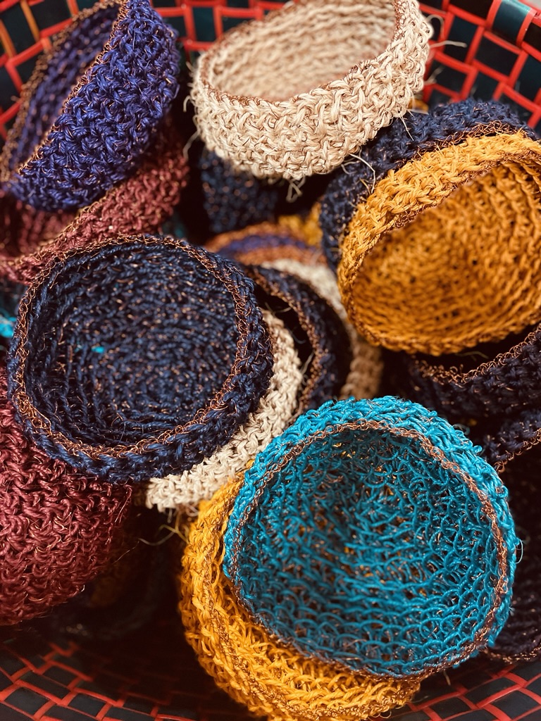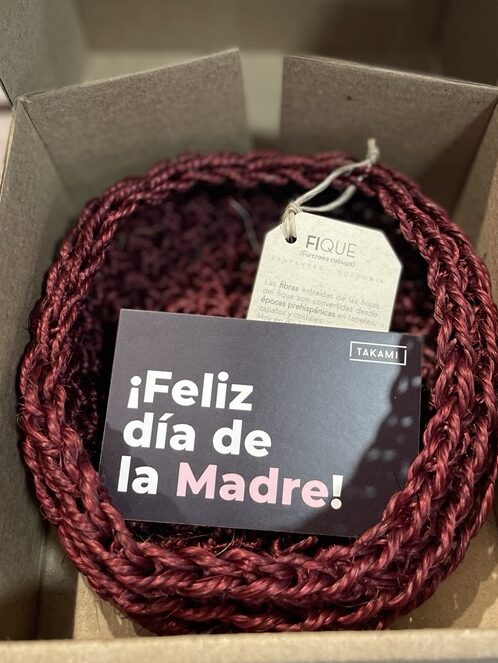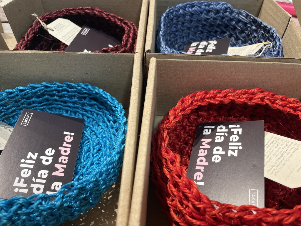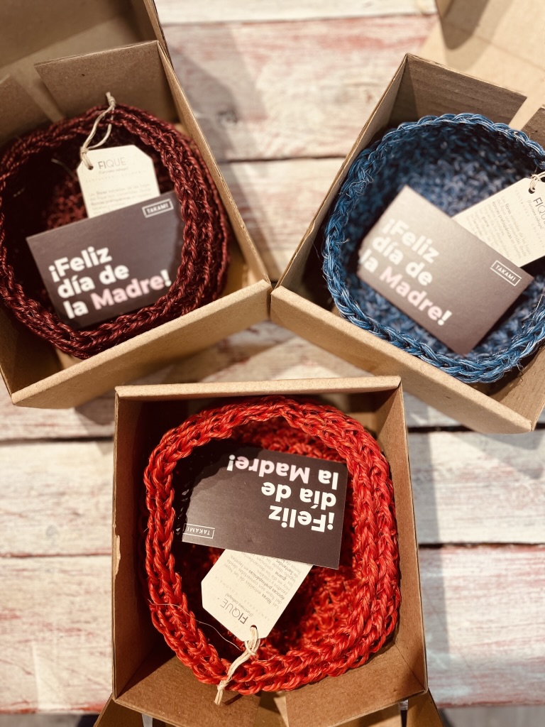 Tejido de canastos en fique de colores para regalos del día de la madre.
